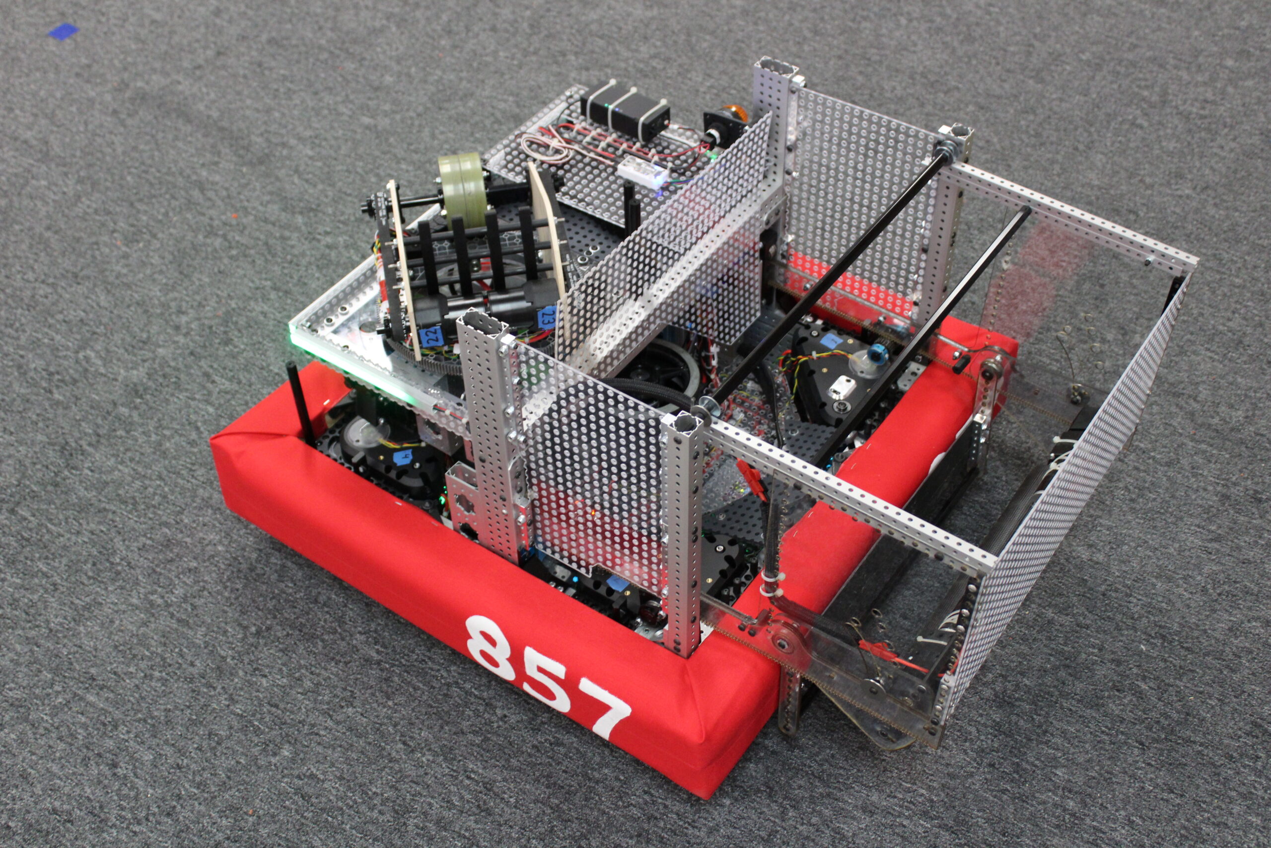 The team’s inaugural robot as 857, it featured a Kiwi drive controlled by a unique joystick mechanism.